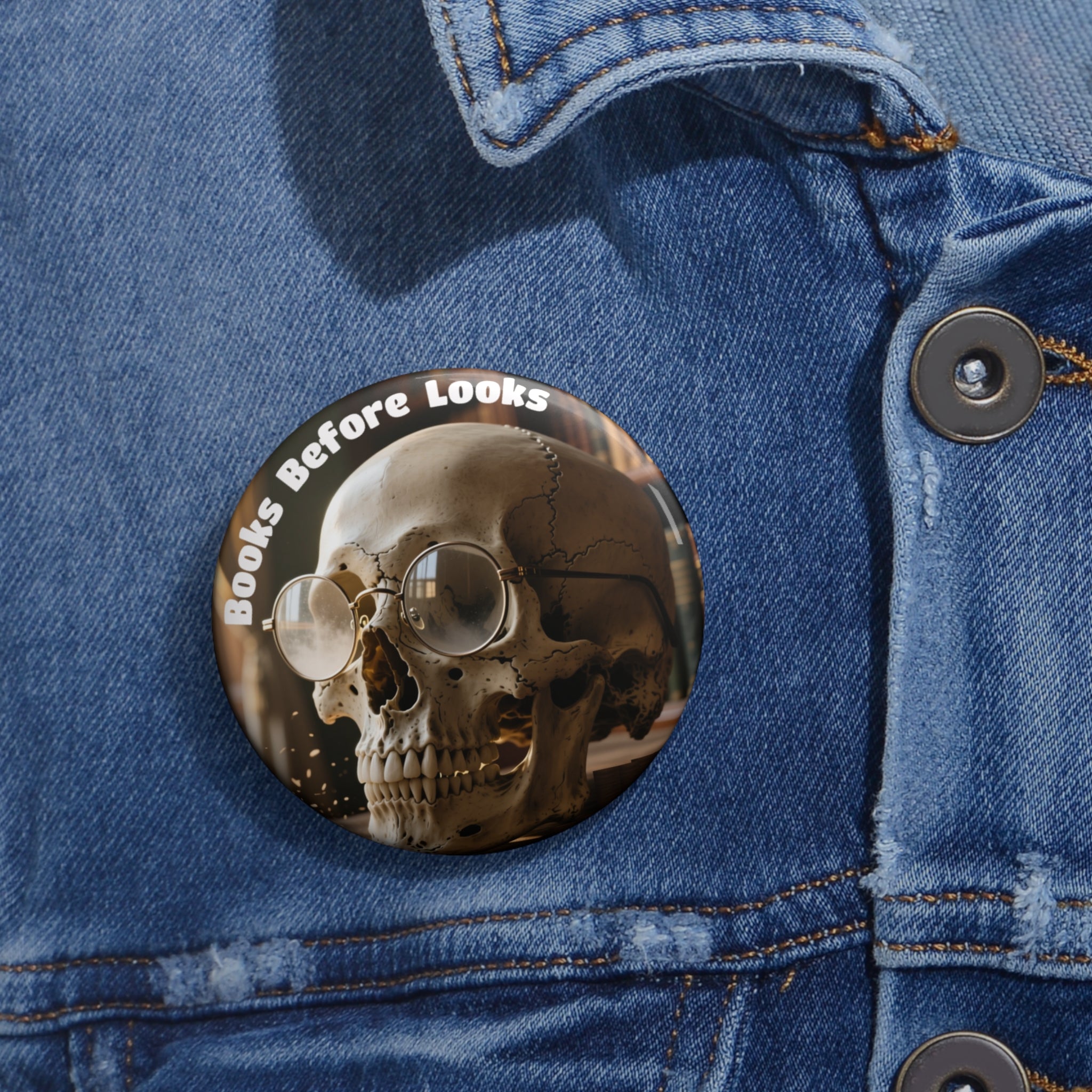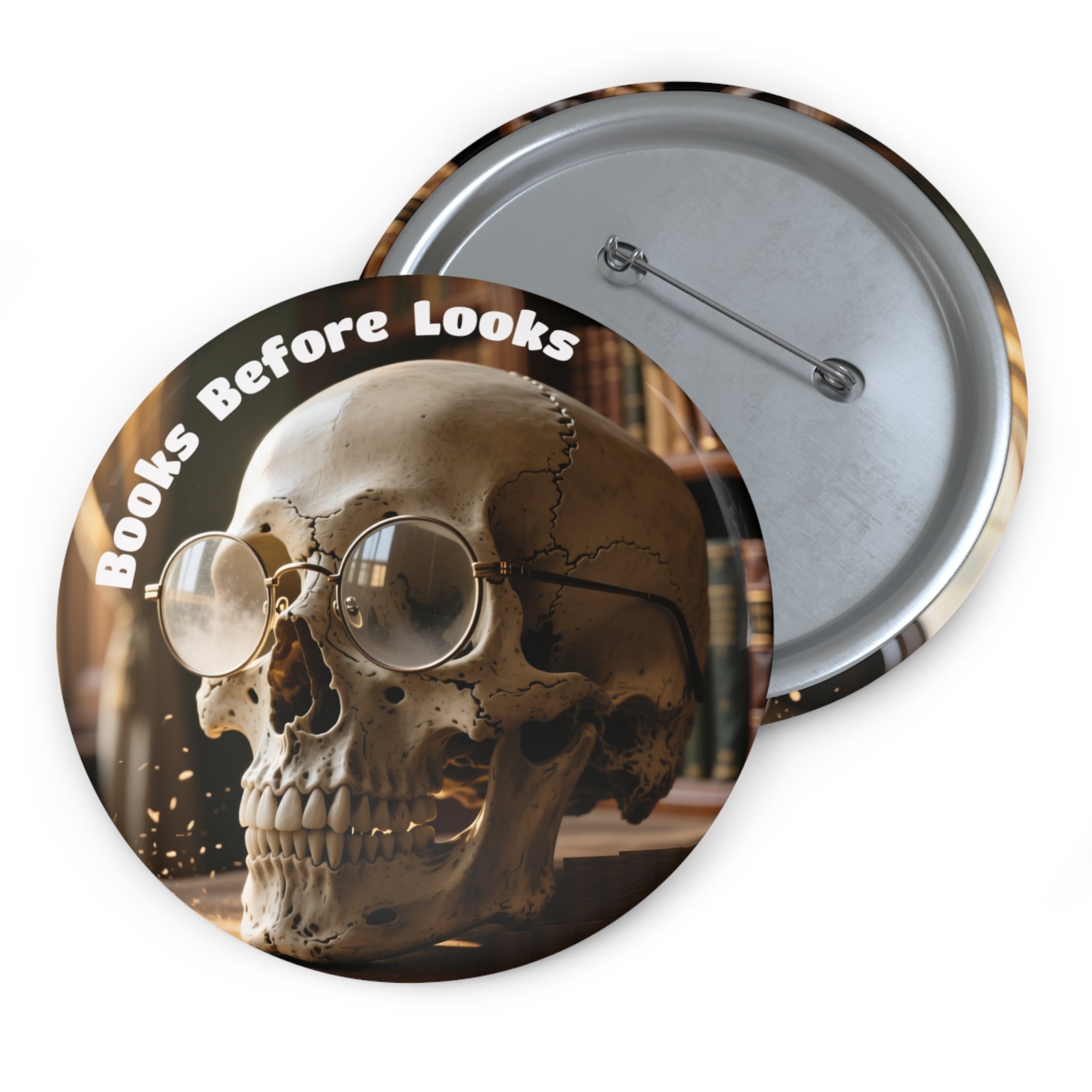 Celebrate your love of reading with this bold and quirky “Books Before Looks” pin. Featuring a human skull wearing glasses against a backdrop of neatly stacked books, this design blends dark academia with nerd pride. Perfect for book lovers, librarians, students, introverts, and anyone who values brains over beauty.