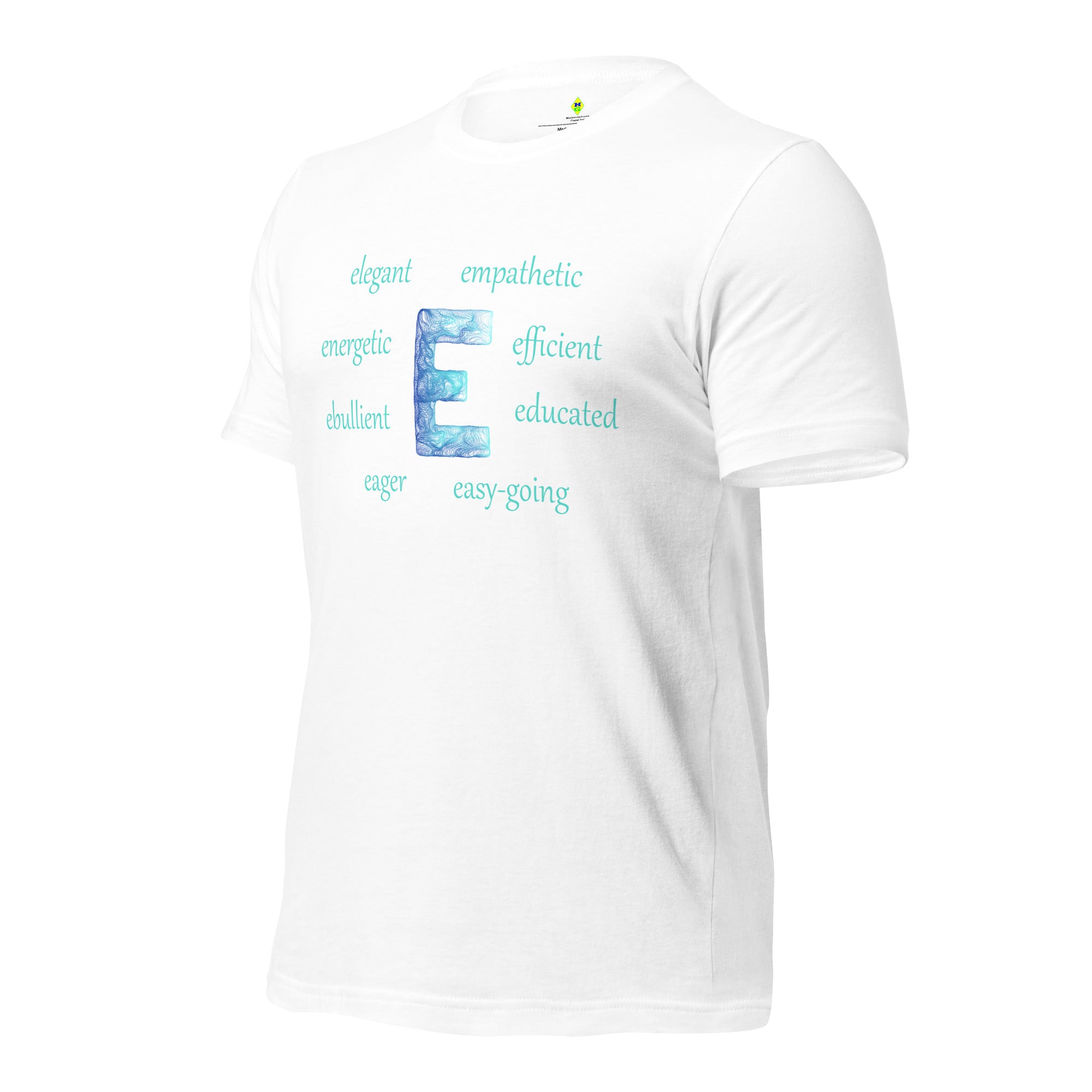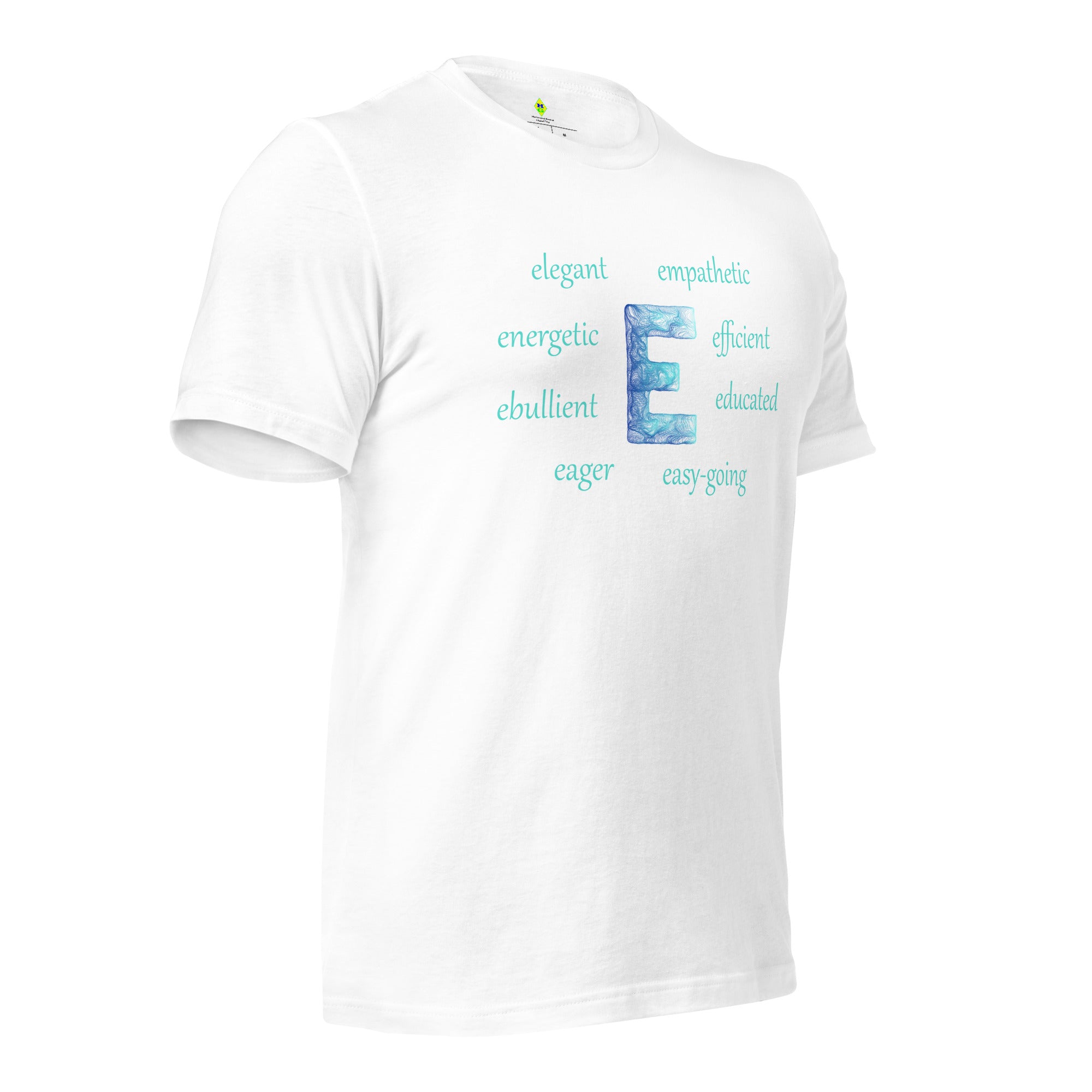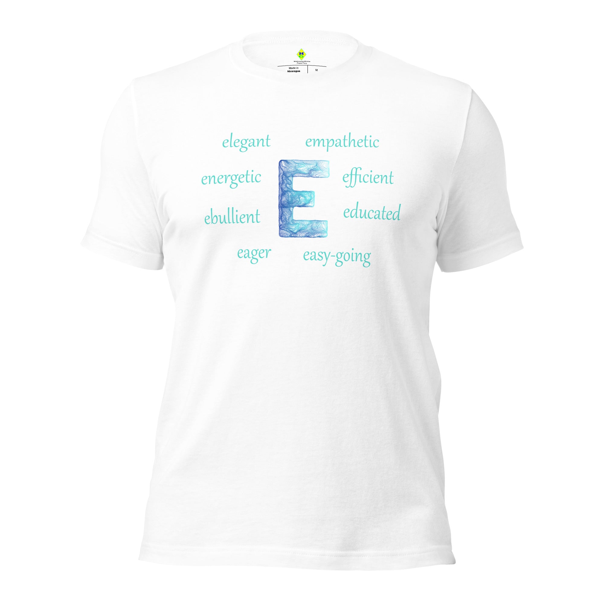 The “E” shirt radiates enthusiasm and empowerment. Filled with encouraging E-words like energetic, empathetic, and elegant, it motivates positivity and personal strength. Made from soft, pre-shrunk cotton for ultimate comfort.