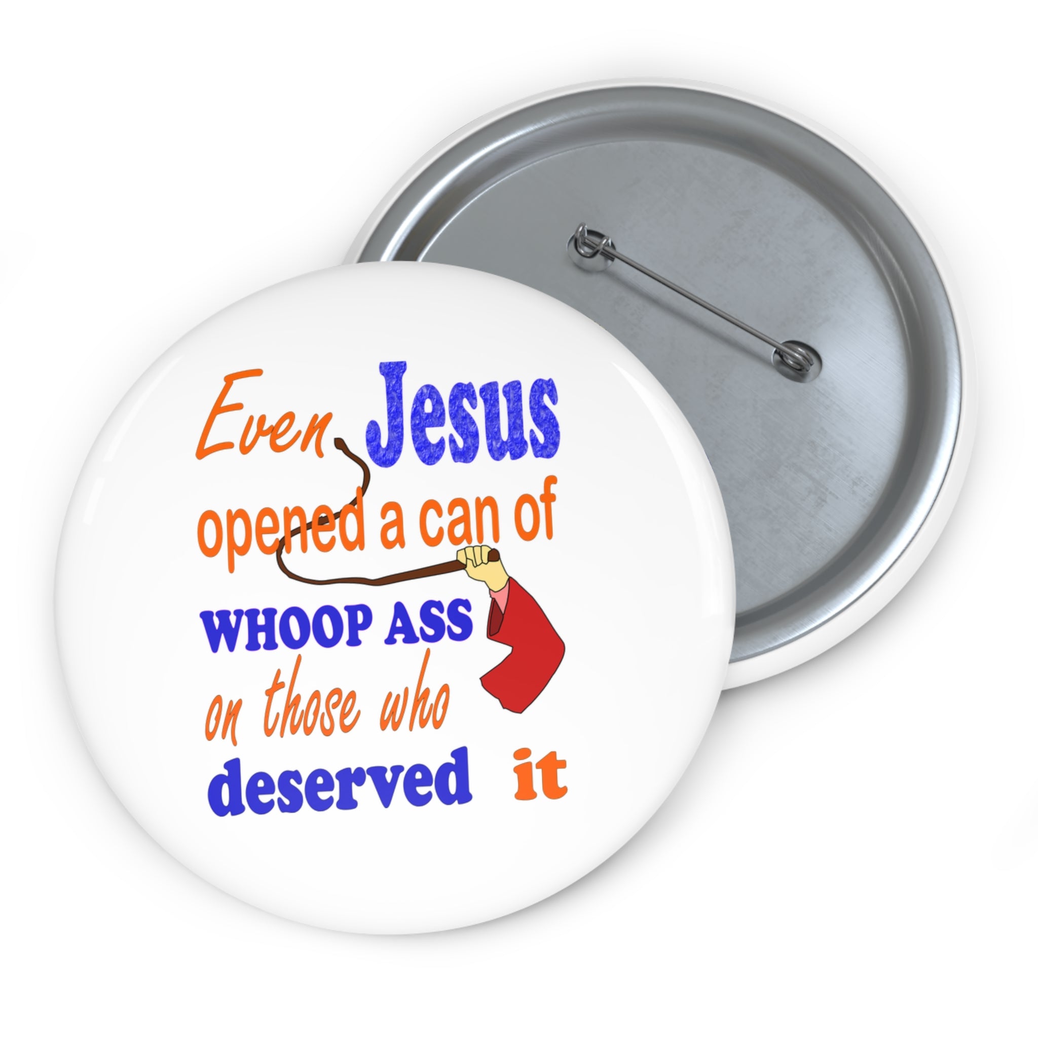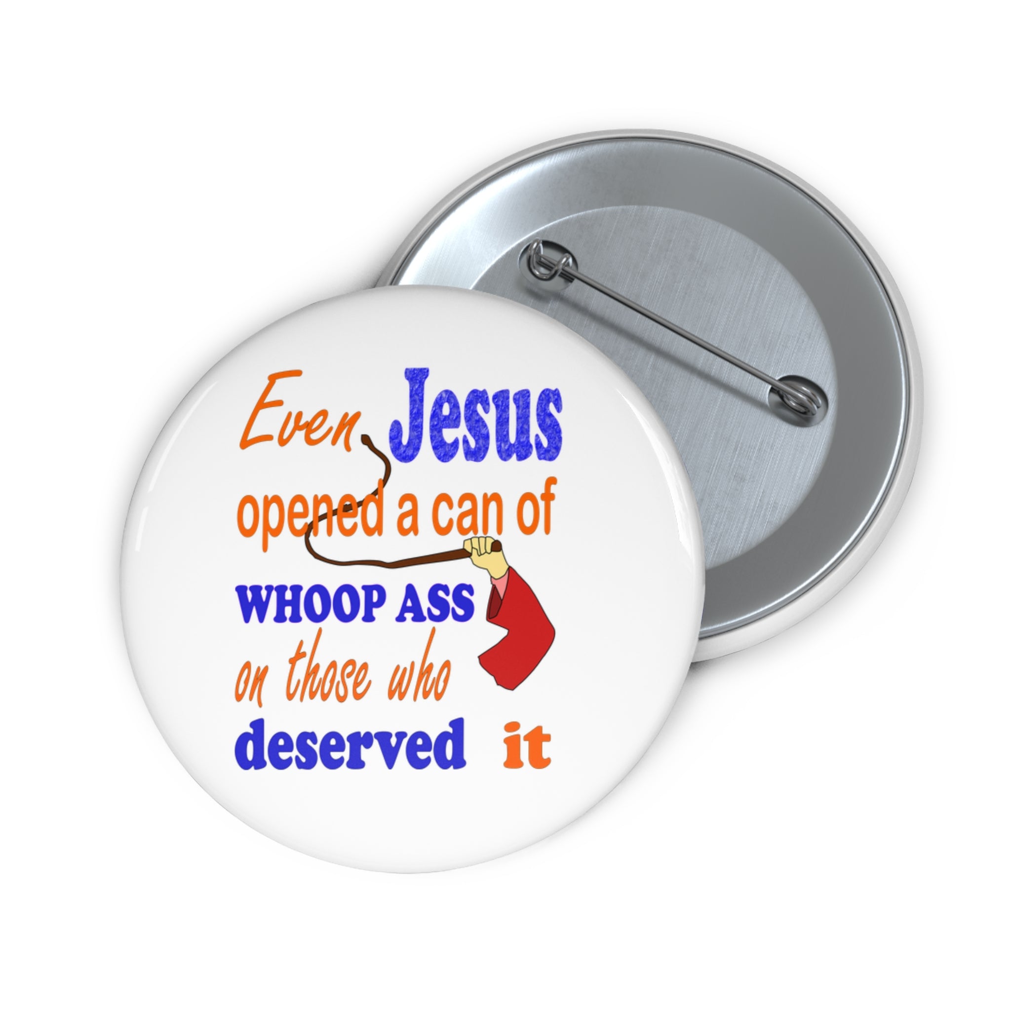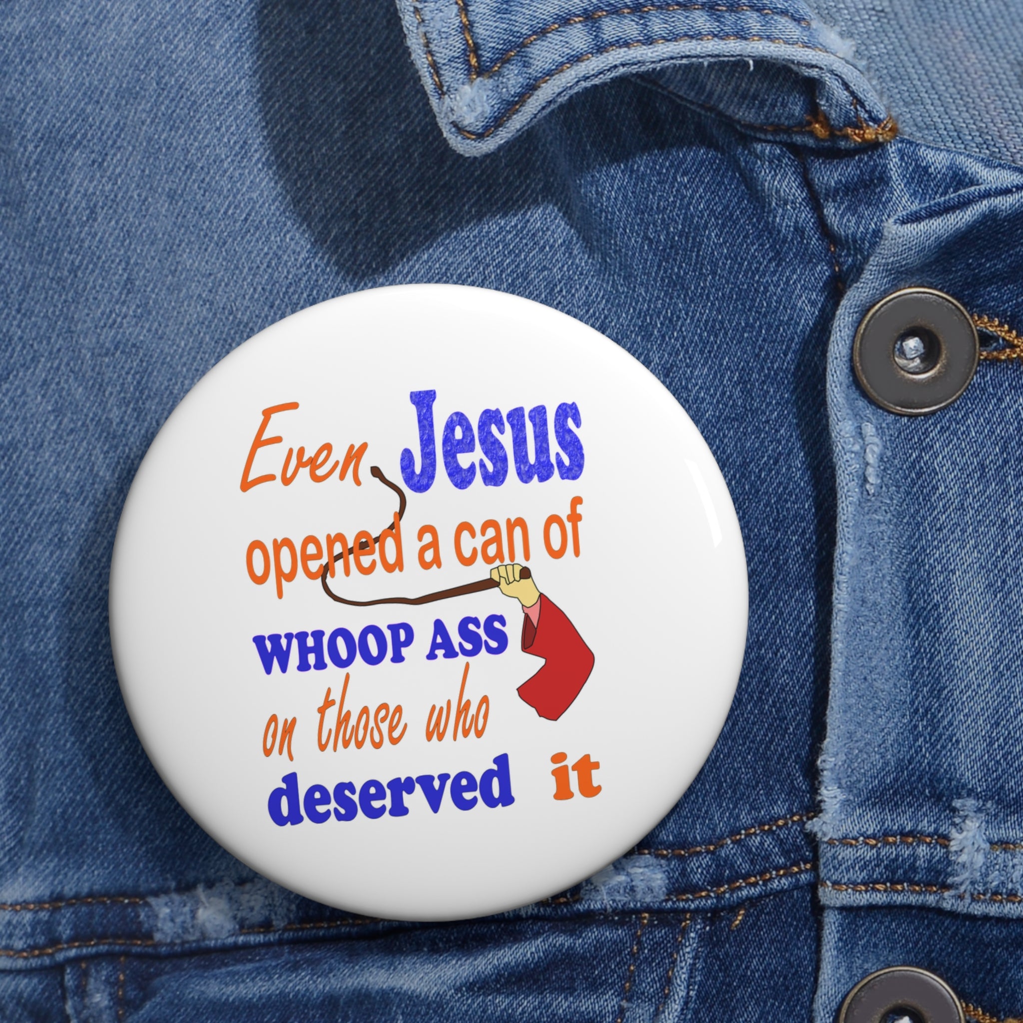 Make a statement that’s fierce, funny, and a little bit fearless with this unforgettable pin featuring a hand gripping a whip and the caption: “Even Jesus opened a can of whoop ass on those who deserved it.” Inspired by the famous moment of righteous temple-cleansing, this pin blends humor, attitude, and a dose of truth for anyone who believes in standing up for what’s right.