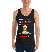• Load image into Gallery viewer, black unisex tank top stating even jesus opened a can of whup-ass on those who deserved it