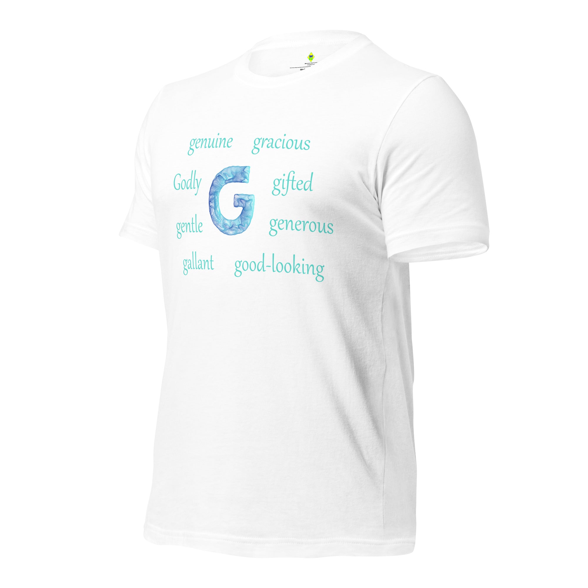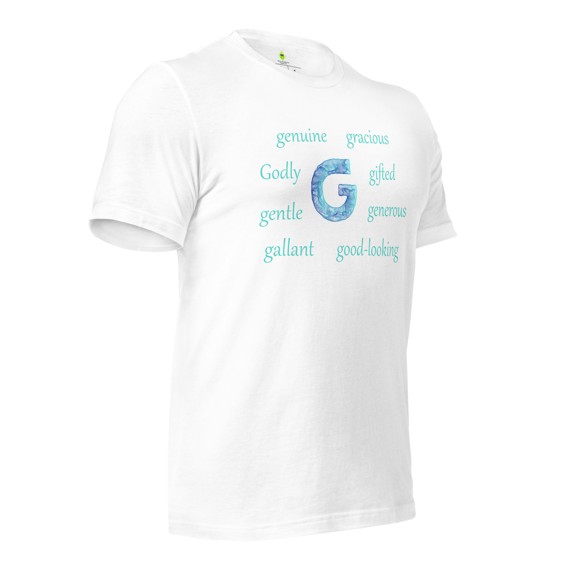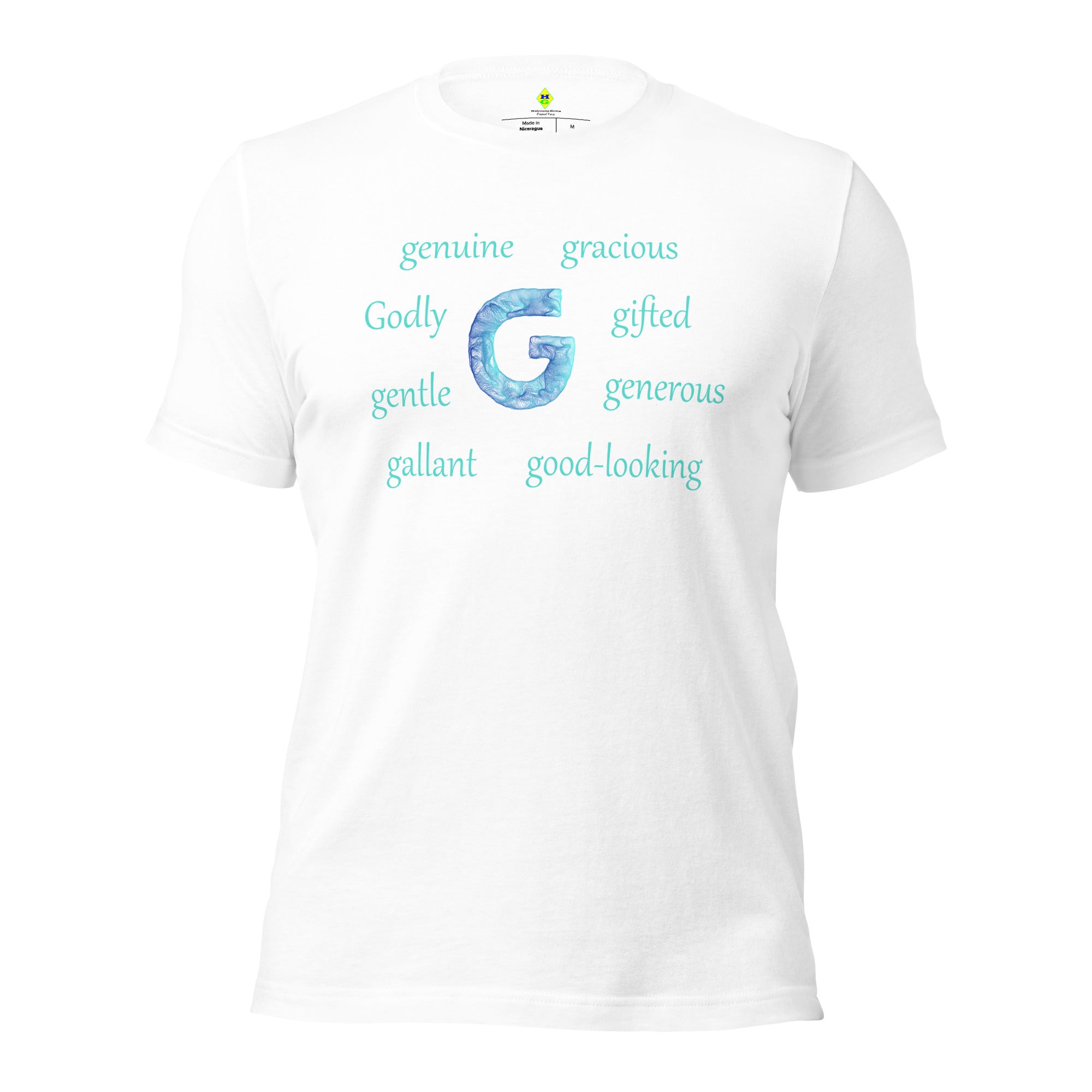Show gratitude in style with this “G” t-shirt surrounded by uplifting words like gracious, grounded, and gifted. It’s a comfortable reminder to stay thankful and centered throughout your day. This t-shirt is everything you've dreamed of and more. It feels soft and lightweight, with the right amount of stretch. It's comfortable and flattering for all.