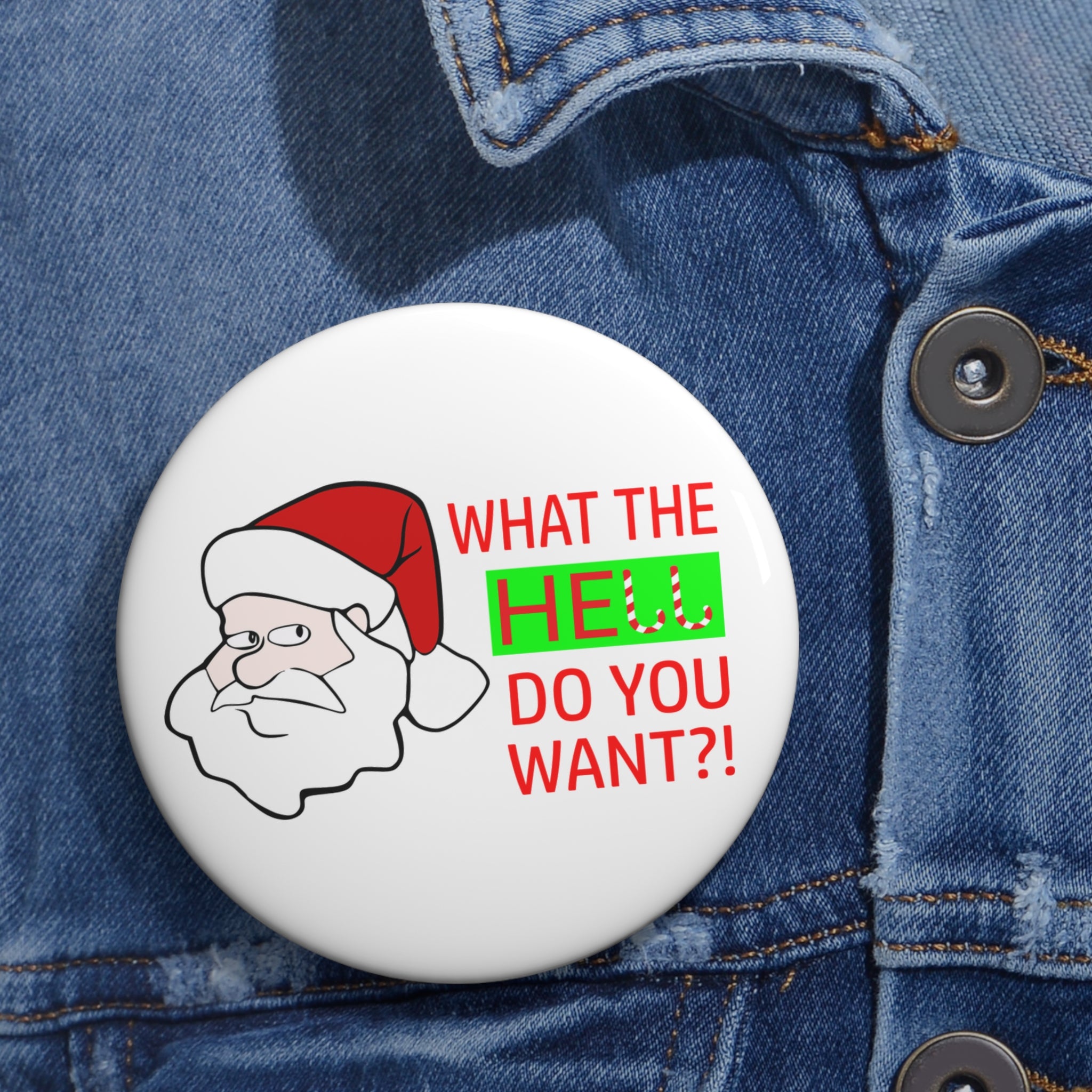 Bring a little mischievous cheer to the season with this bold and hilarious Grumpy Santa pin button. Featuring a cranky Santa illustration and the caption “What the hell do you want?” — with the two candy-cane L’s adding a playful twist — this pin is perfect for anyone who enjoys a fun, not-too-sweet take on Christmas spirit.