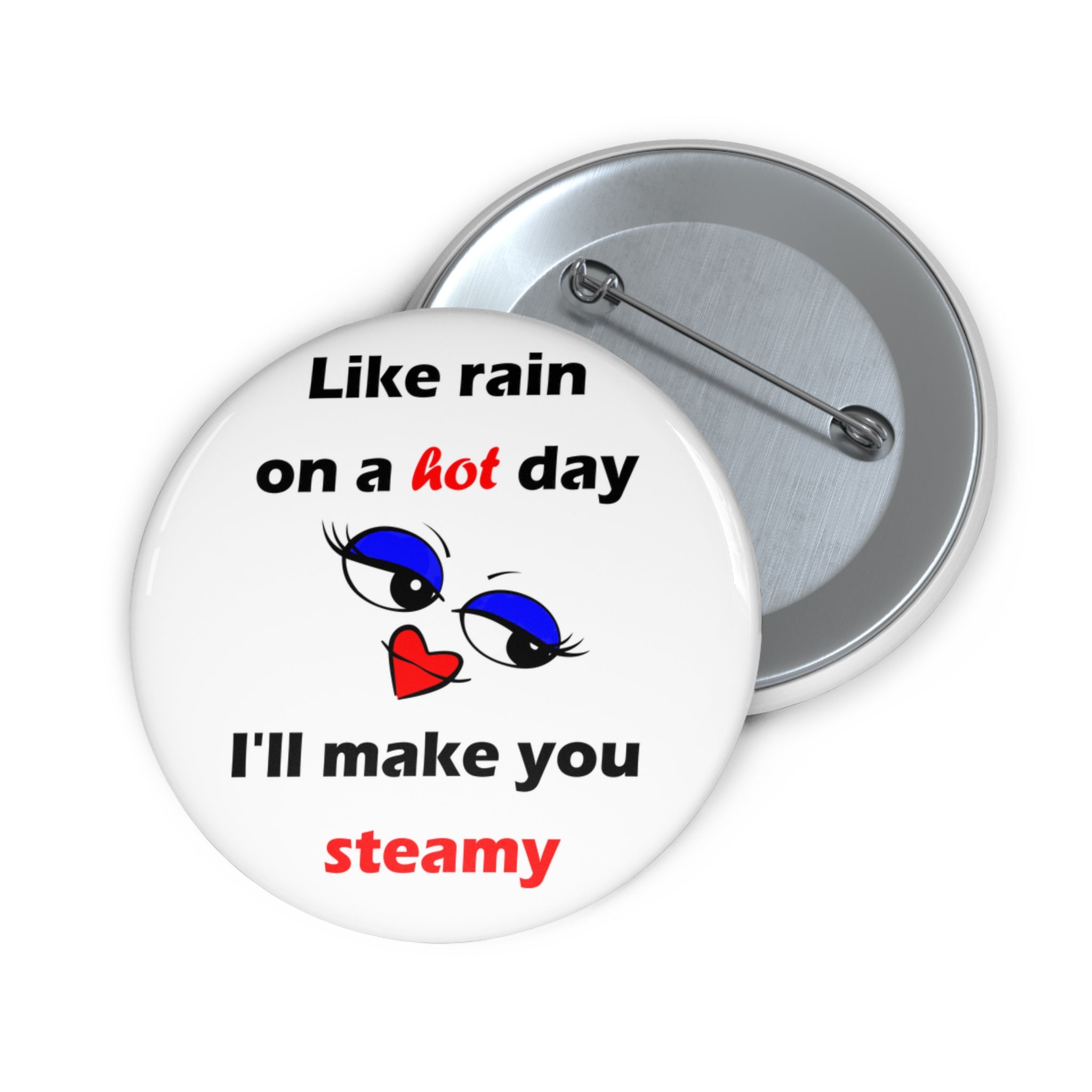Turn up the temperature with this bold and playful “Like rain on a hot day, I’ll make you steamy” pin. Featuring a pair of sexy–yet–cute illustrated eyes and sultry red lips, this design blends charm, flirtation, and a touch of attitude—all in one glossy little accessory.