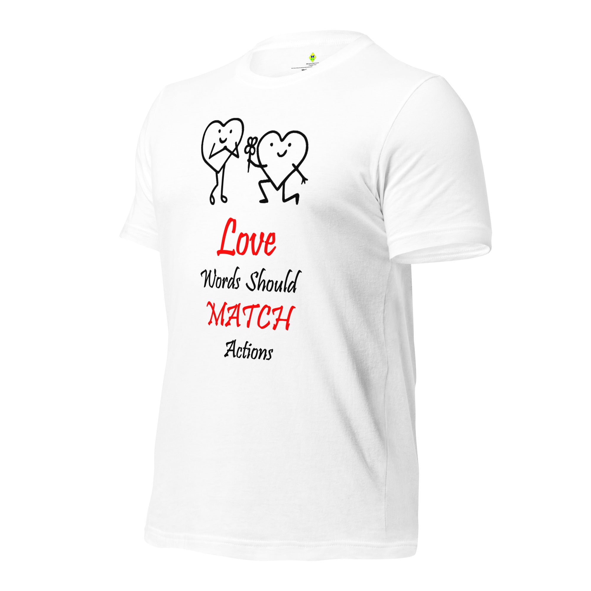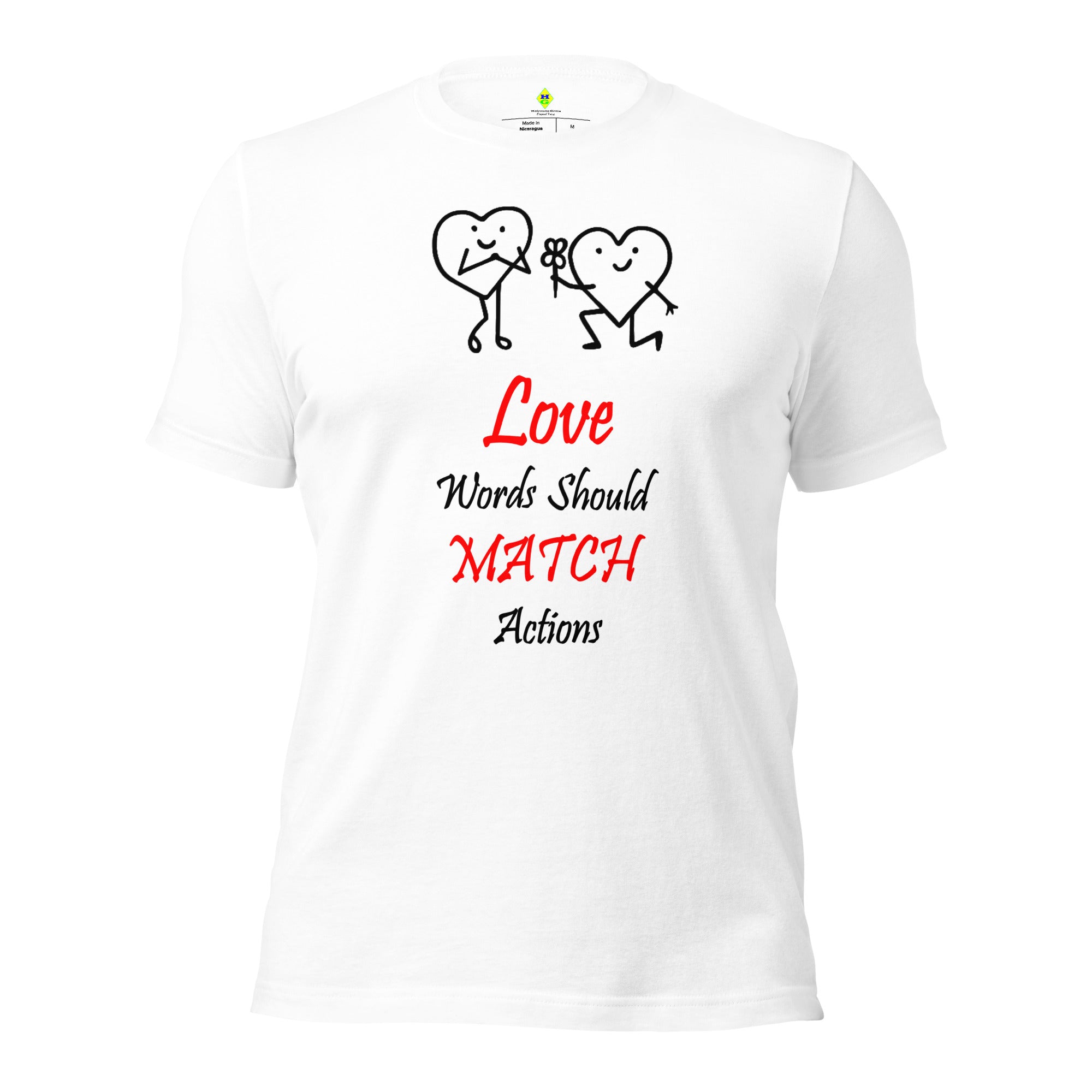 Make a powerful statement about love, respect, and authenticity with this “Love Words Should Match Actions” unisex t-shirt. Featuring a heartfelt illustration of a male heart kneeling and offering a flower to a female heart, this design beautifully symbolizes love that’s shown through actions—not just spoken words.