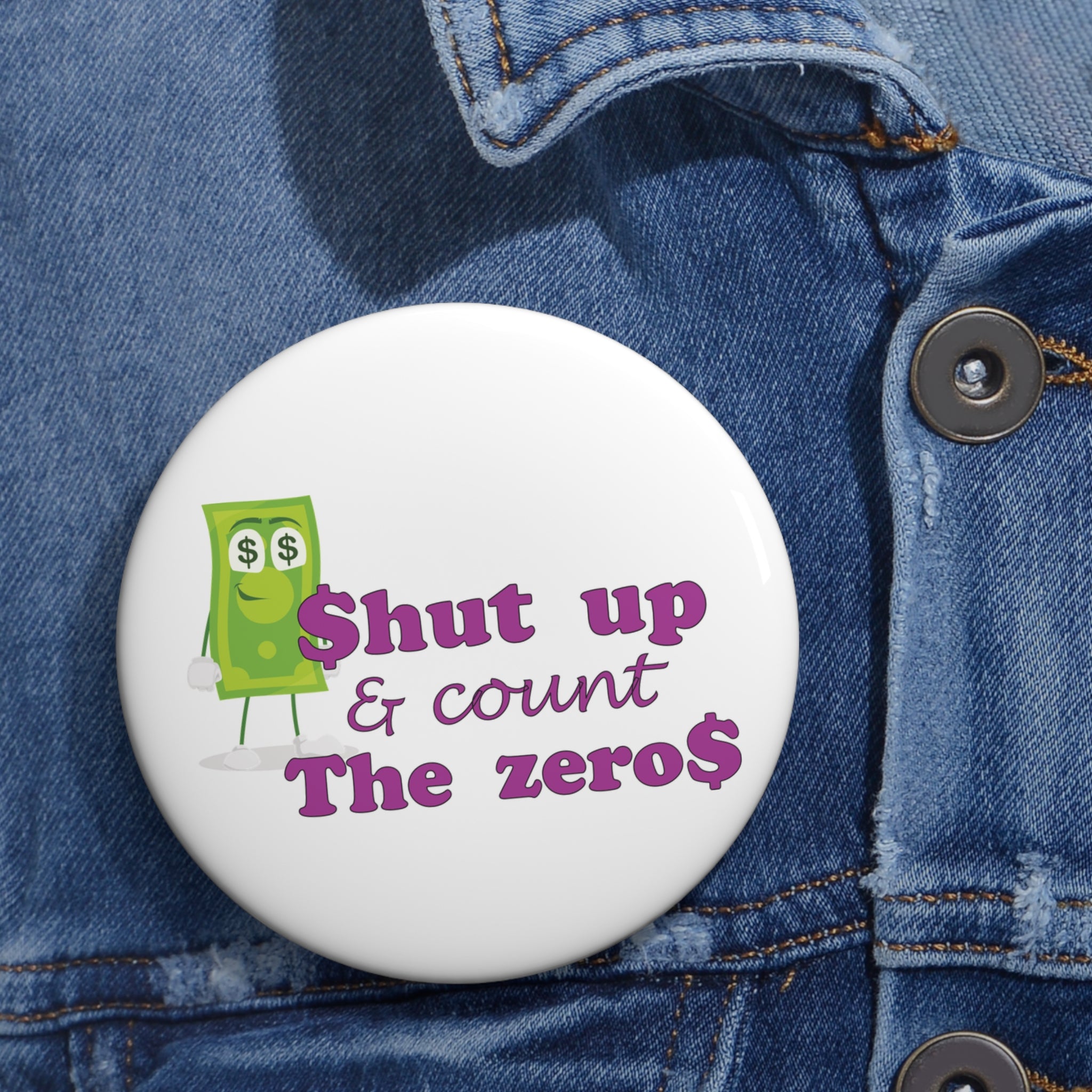 Make your message clear and profitable with this witty pin featuring the bold caption “Shut Up and Count the Zero$” — complete with dollar signs in place of the S’s and a cartoon bill beaming with dollar-sign eyes.