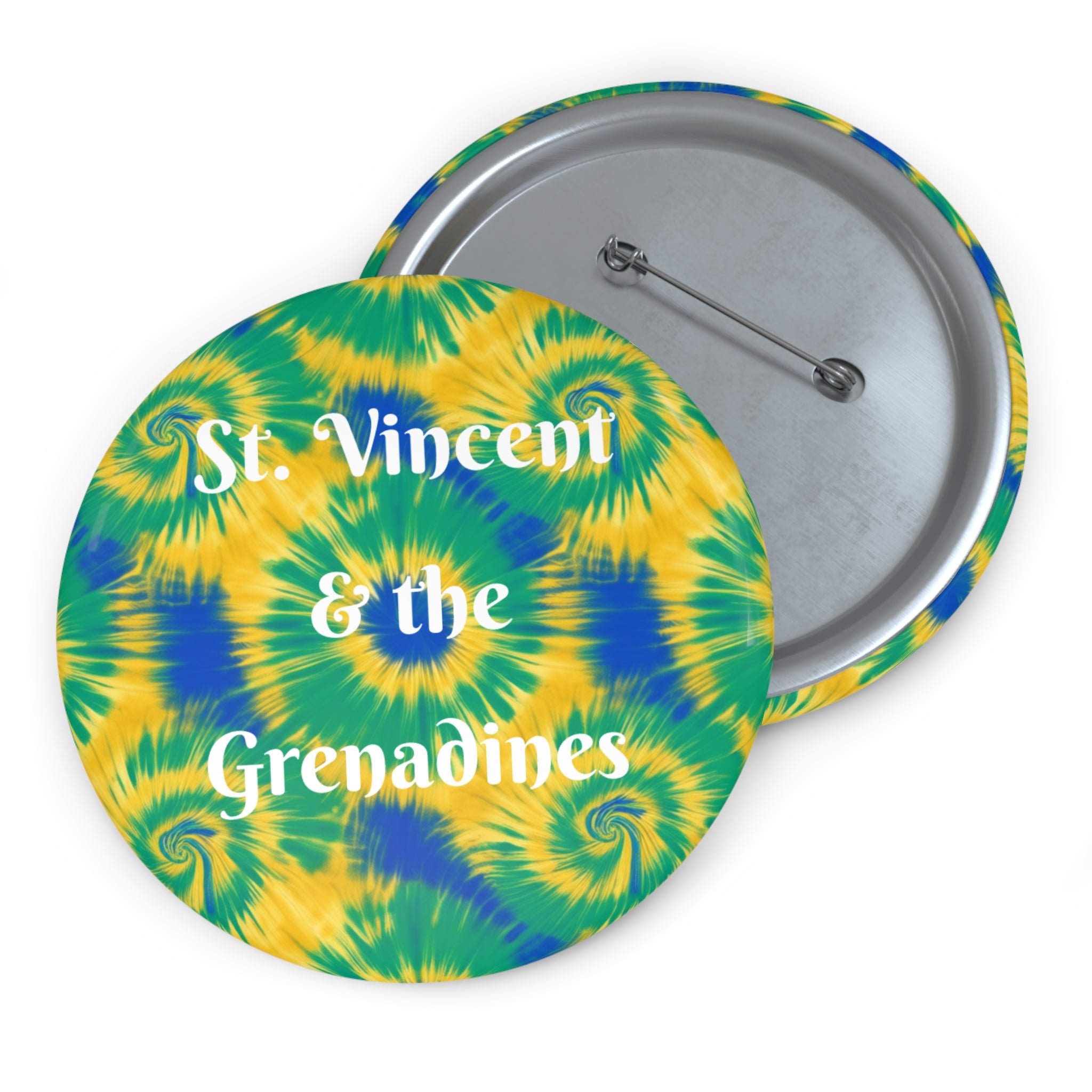 Show your island pride with this vibrant “St. Vincent and the Grenadines” pin button, set against a stunning tie-dye background of blue, yellow, and green starbursts. Bursting with color and Caribbean energy, this pin adds a bright, joyful touch to jackets, backpacks, totes, hats, or travel gear.