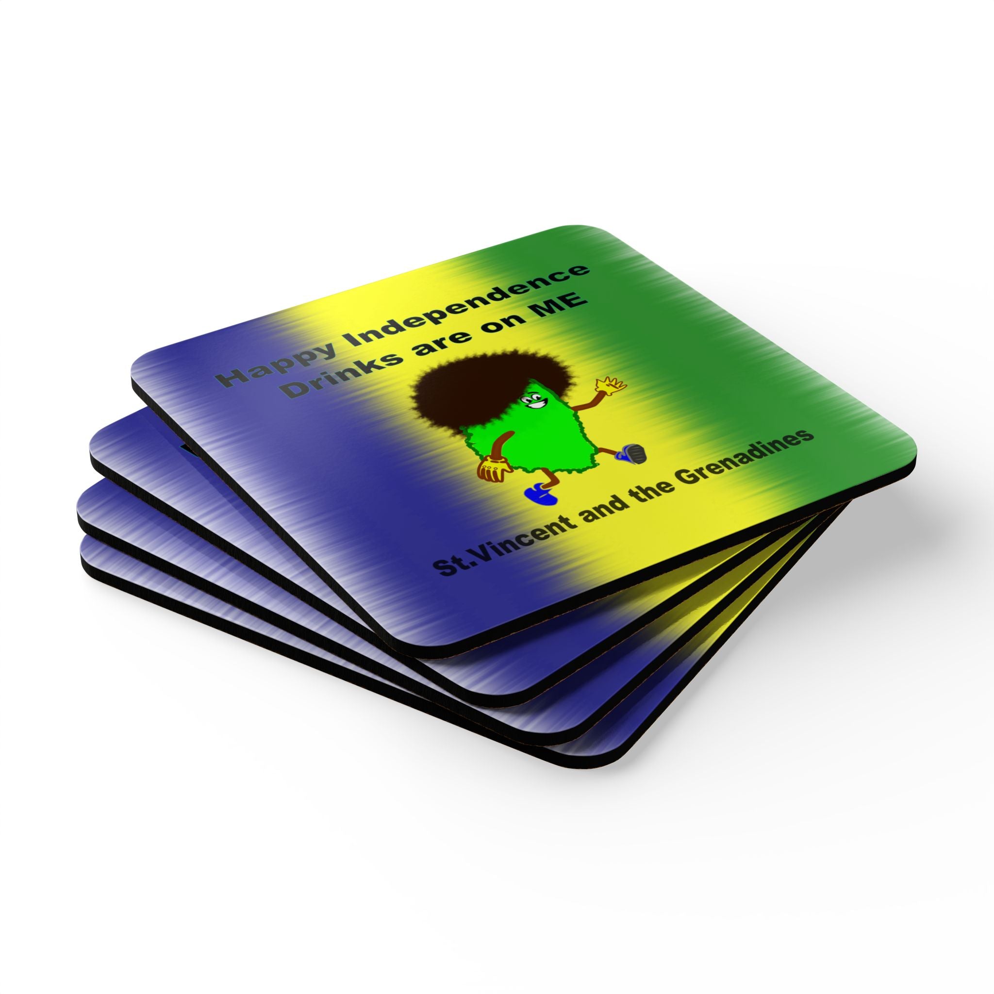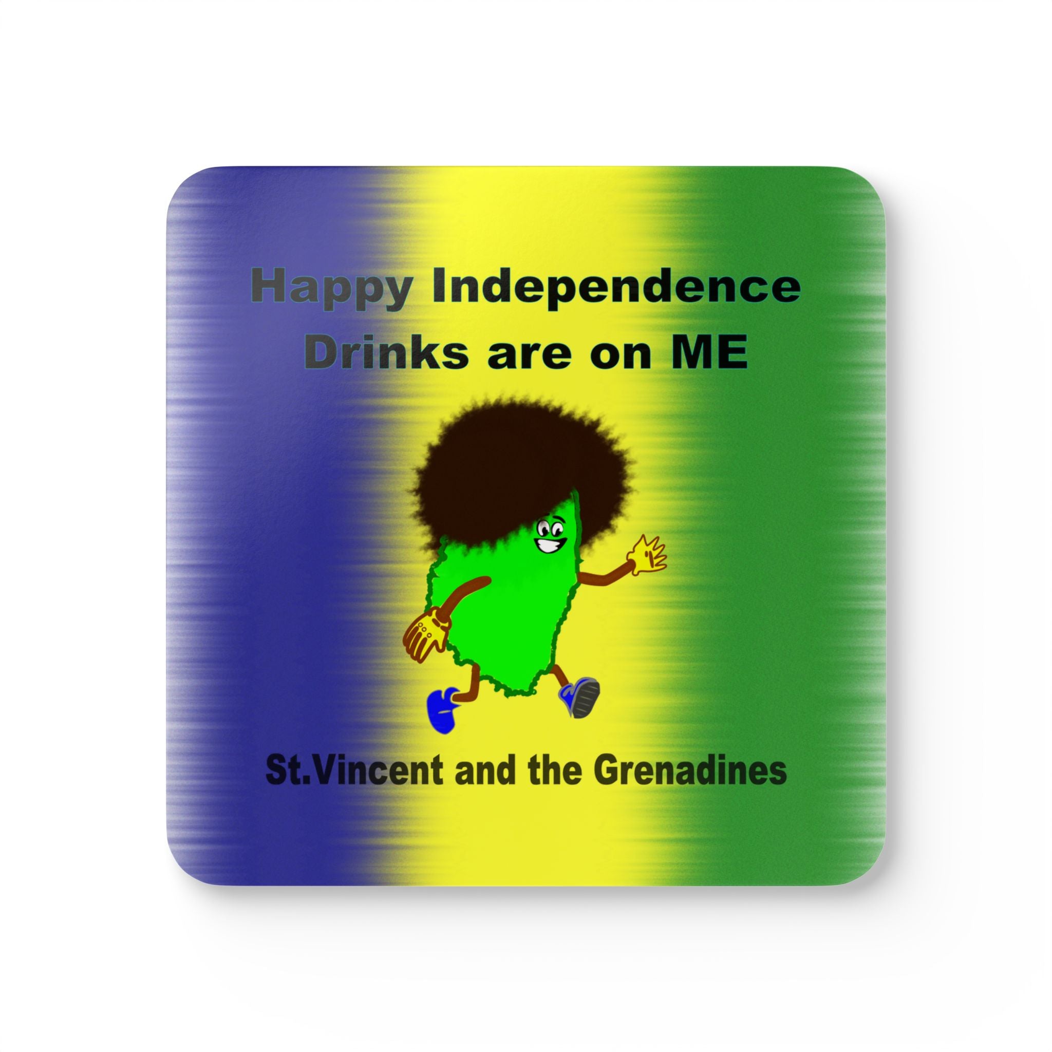 Celebrate St. Vincent and the Grenadines with this 4-piece Independence Day coaster set featuring a cheerful cartoon map on a vibrant backdrop of national colors. The caption “Happy Independence – Drinks Are on Me” sits above the design, with “St. Vincent and the Grenadines” proudly displayed below. Perfect as a festive souvenir, party accessory, or thoughtful gift, these coasters add island spirit to every sip.
